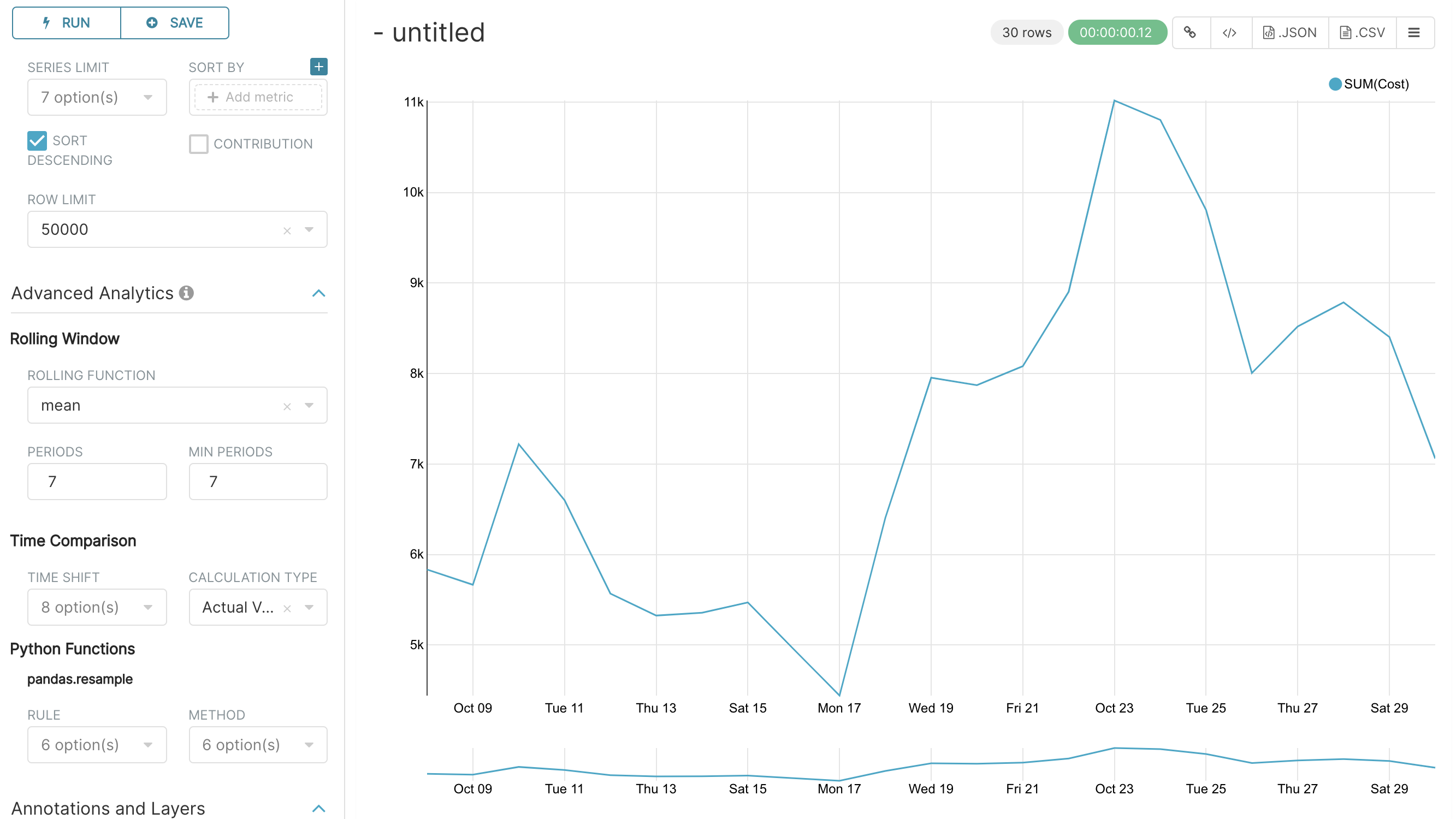 Next, in the Python Functions subsection of Advanced Analytics, enter 7D, corresponding to seven days, in the Rule and median as the Method and show the chart by selecting Run Query.